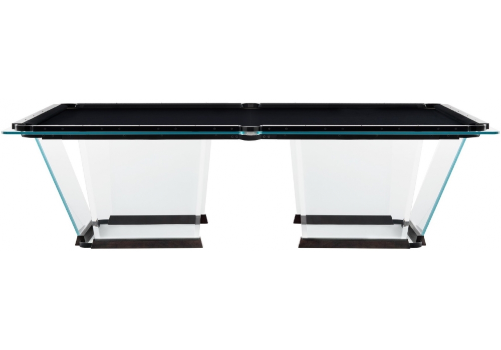 A crystal sheet 15 mm thick is “sculpted” into an elegant Pool Tables collection the pool table designed by Marc Sadler for Teckell. Among the original details are a jet black playing surface covered in black cloth and a contoured base that emphasize the table’s sleek lines accentuate its form and create the optical illusion of a floating playing surface. The legs are glass plates with beveled edges on both sides that ensure the table is stable; the base is made of solid wood with carved grooves for securing the glass and hiding the perfect regulation system. The definition of a design that is functional and fun a reawakening of our playful spirit. A sculpture that embellishes a room. Crystal table and legs solid wood base pockets hiding a flexible polyurethane net. Accessories are also available including a pool cue holder hanging lamp professional and stylish cues pool balls and a rack. A patented system is used to attach the cloth covering to the playing surface. Billiards is not only a game, it is a fine art that combines intuition, concentration and creativity. A work of genius designed and made entirely in Italy named after a great Italian sportsman for whom billiards meant life, challenge and passion. In billiards what counts is not what happens, but the infinite possibilities that precede it, the thrill of the choice. A match against oneself.