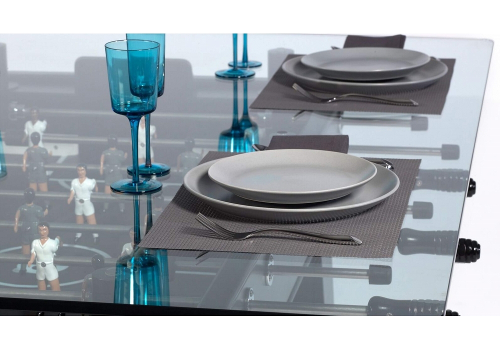 RS#Dining Table conçue par José Andrés & Rafael Rodríguez pour RS Barcelona est une table rectangulaire/football de table disponible en 6 différentes finitions. Disponible aussi en 2 hauteurs et versions. Ensemble de balles (7 unités) et 2 joueurs supplémentaires inclus.