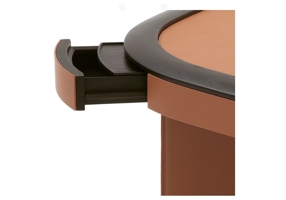 Flamingo conçue et produite par Giorgetti est une table de jeu à quatre positions, plateau en verre gris et bords en frêne massif en différentes finitions. Le dessus est équipé de quatre tiroirs avec plateaux internes, et est équipé d'un tapis de jeu en tissu Harvard d'un côté et en Pelle Plus de l'autre, en différentes couleurs. La base de la table est recouverte de Pelle Plus, en combinaison avec le tapis supérieur.