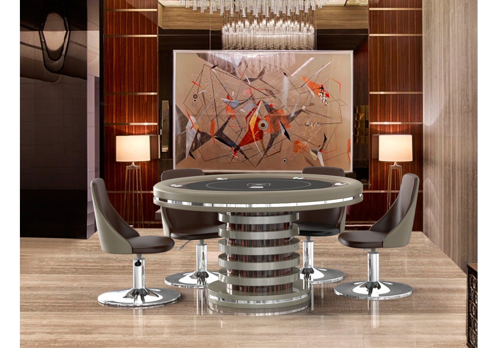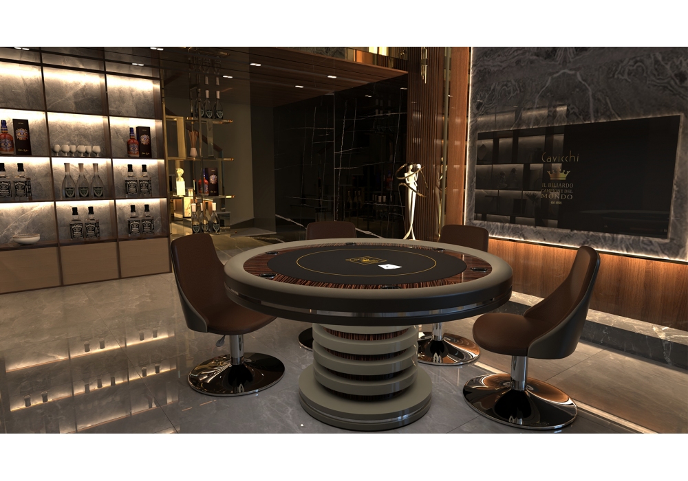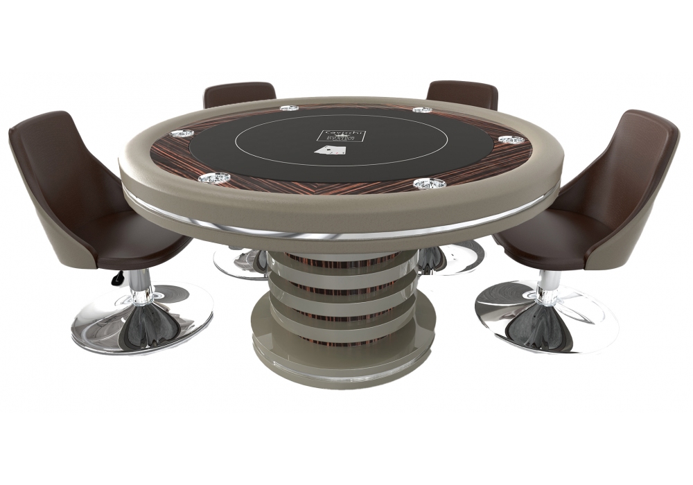 Grecale conçue par Cavicchi est une table de poker, la surface de jeu circulaire, entièrement doublée sur le bord, repose sur la base raffinée de la tour où alternent des disques spéciaux finis en bois précieux et laqués. Différentes finitions disponibles sur demande.