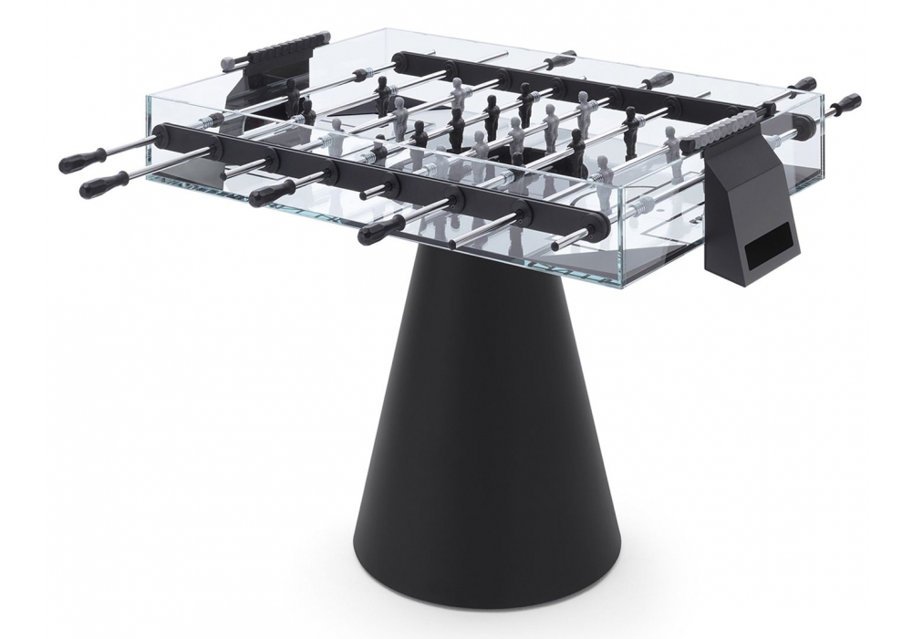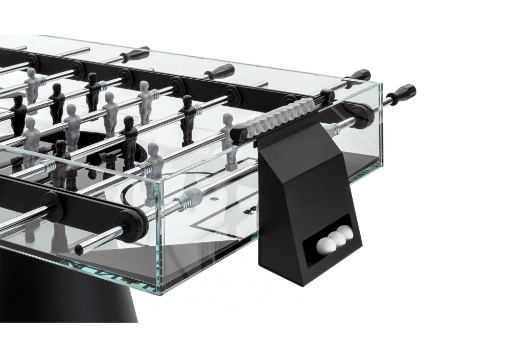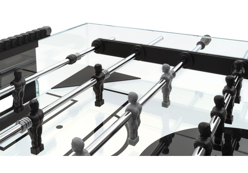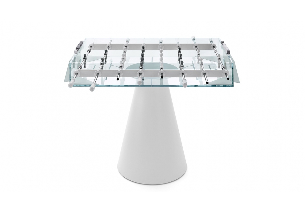 Ghost conçu par Basaglia + Rota Nodari pour Fas Pendenza est un baby-foot quadrangulaire avec un terrain de jeu en cristal transparent. Le meuble est entièrement réalisé en verre transparent. La base est de forme conique en métal peint d'une couleur anti-rayures avec des pieds réglables. Ghost est disponible en différentes finitions et versions de manche, il est fourni avec 5 boules de jeu blanches.