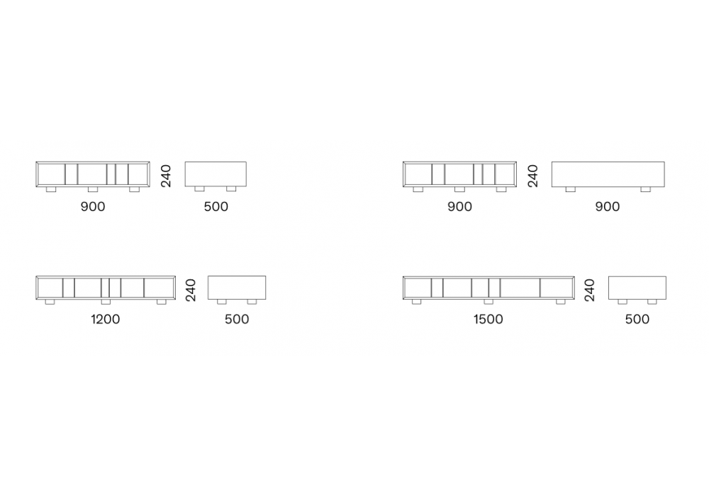 | Dimensions | 90 x 50 x H 24 cm; 120 x 50 x H 24 cm; 150 x 50 x H 24 cm; 90 x 90 x H 24 cm. |