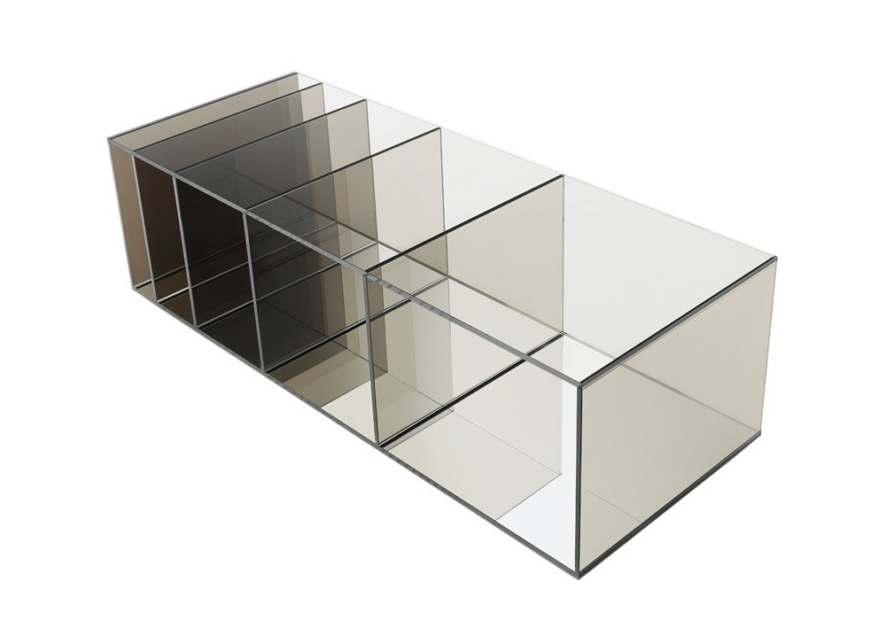 Deep Sea conçue par Nendo pour Glas Italia est une table basse rectangulaire avec plateau en verre extralight transparent stratifié et thermoscellé. Les éléments verticaux sont en verre coloré transparent dans les tons gris ou bleu.