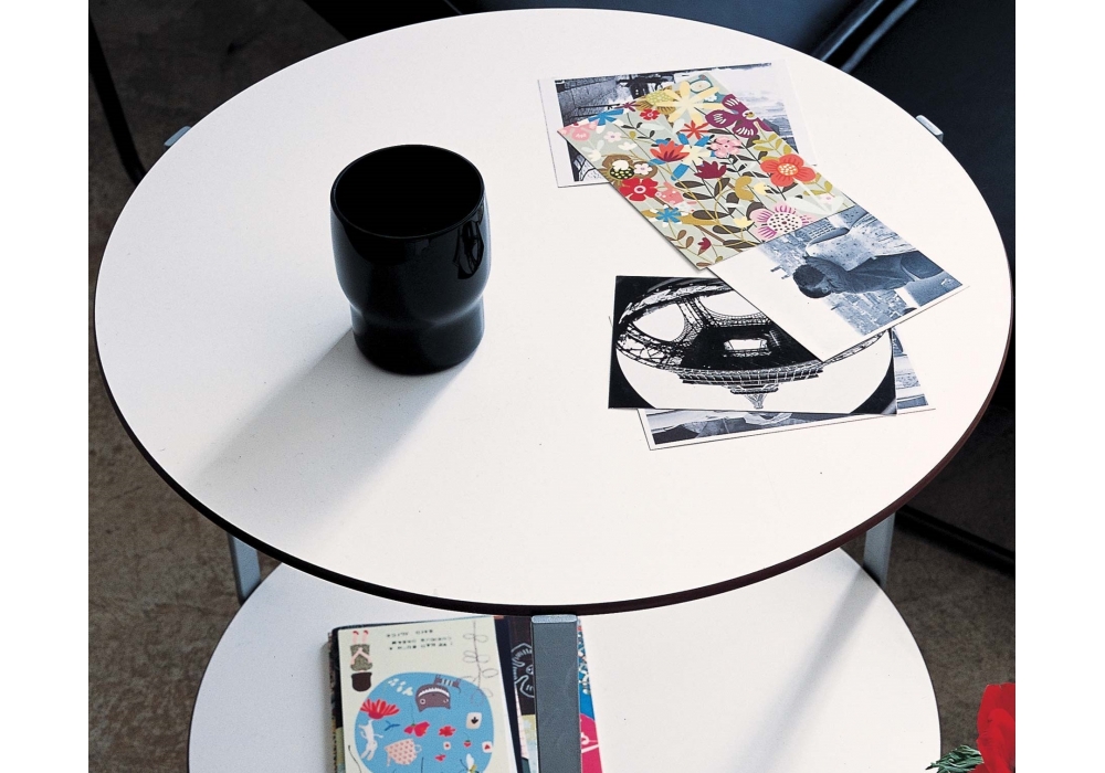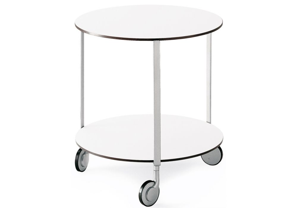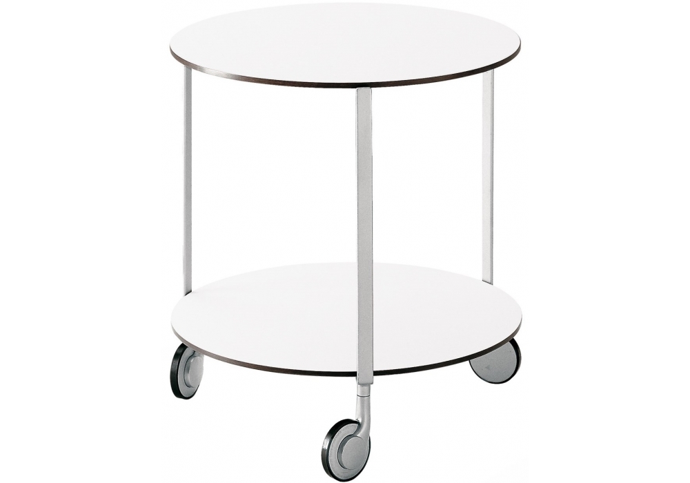 635 Girò conçue par Anna Deplano pour Zanotta est une table basse avec roulettes. Structure en acier peint, couleur aluminium. Étagères en stratifié plastique stratifié, couleur blanche. Disponible en différentes dimensions.