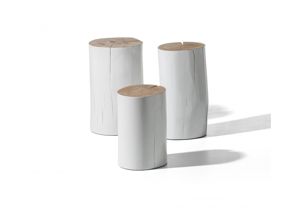 Log conçue par Paola Navone pour Gervasoni est une petite table/pouf, représentant une section de tronc de hêtre écorcé et laqué noir ou blanc brillant à l'extérieur.