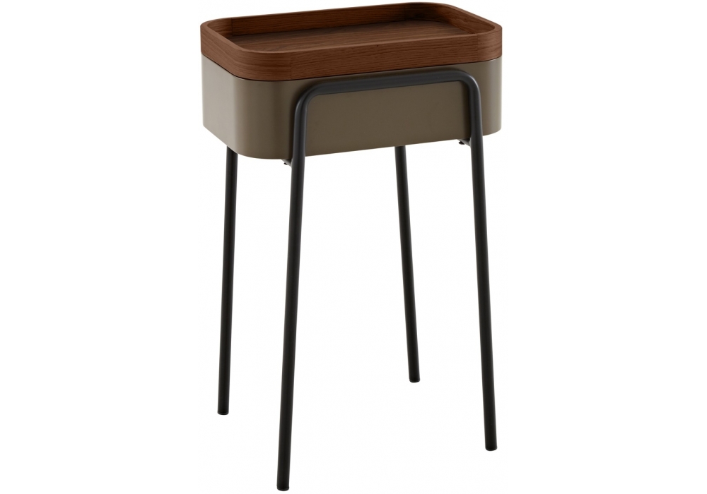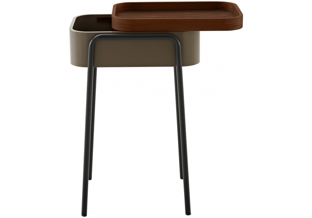 Couliss designed by Philippine Lemaire for Ligne Roset is an occasional table. Chest in elephant lacquered wood (exotic Ayous); sliding upper top in natural varnished solid American walnut; base in black lacquered steel.