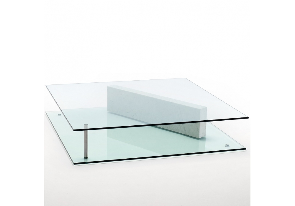 Plane designed by Massimo Mariani for Living Divani is a sculptural piece that carries tha mind to the expressive side of geometry, the delicate balance between solids and spaces. Table made of two tempered glass panels, 120x120cm with 12mm thick, with rounded corners and beveled edge. The lower glass panel has three through holes to house two pins to insert a slab of solid walnut or white Carrara marble. Both version are finished with a slip proof transparent matt varnish on the upper surface.