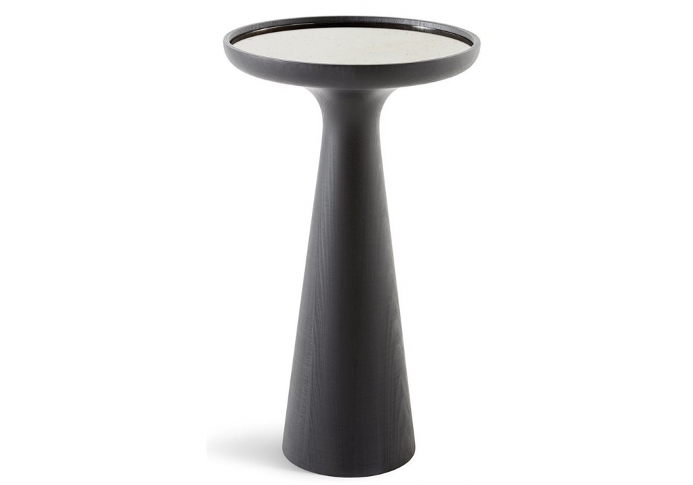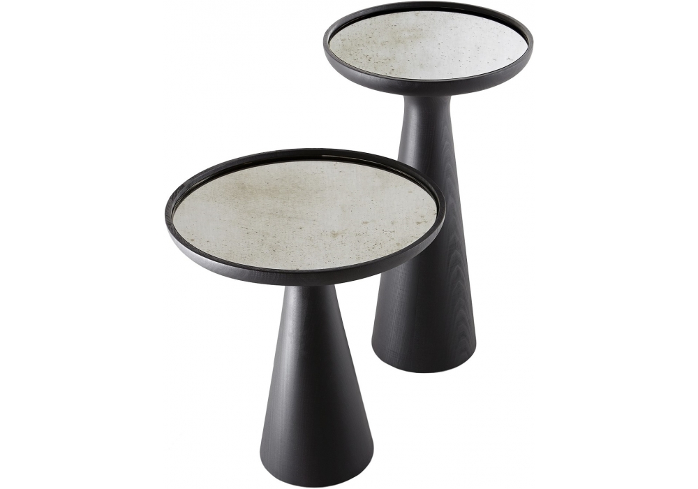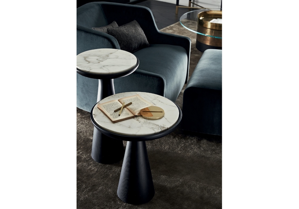 Fante conçue par Studio G&R est une table basse en bois massif laqué noir pore ouvert. Plateau miroité “grigio Italia” fumé. Disponible aussi en miroir “Antique 1”, en marbre Calacatta Vagli Oro ou en marbre Verde Alpi.