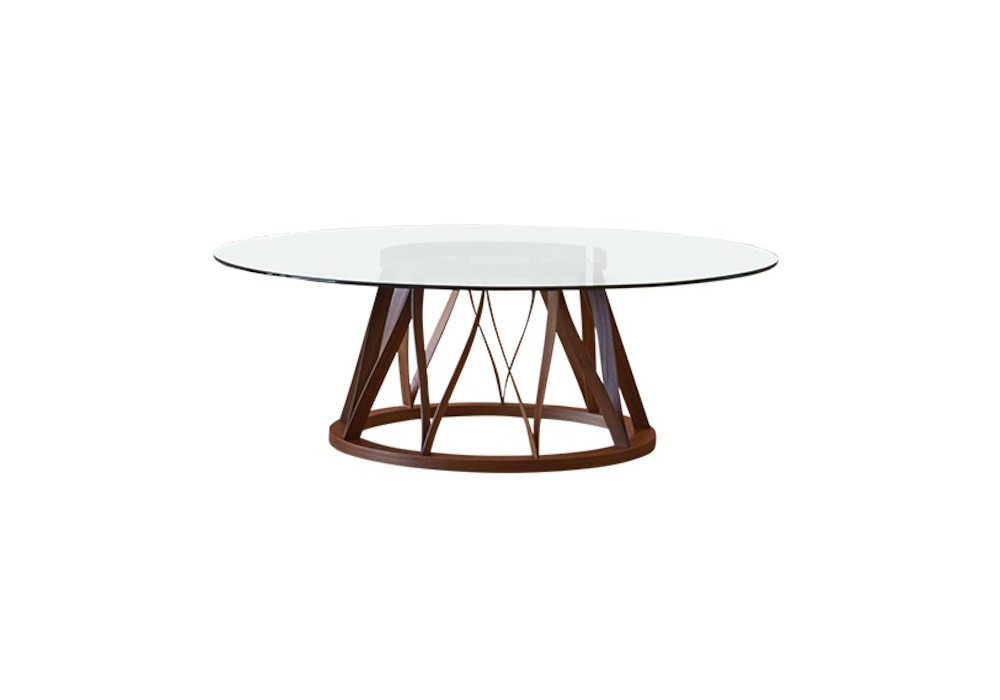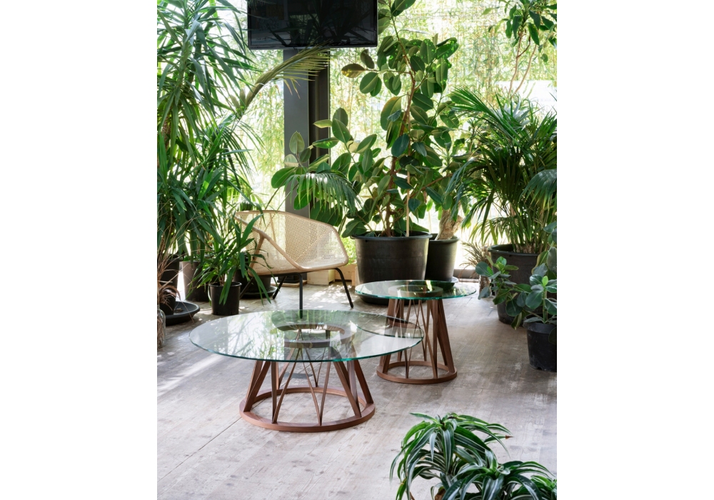 Acco conçue par Florian Schmid pour Miniforms est une table basse avec base en noyer canaletto et plateau en verre trempé transparent. Disponible en différentes tailles.