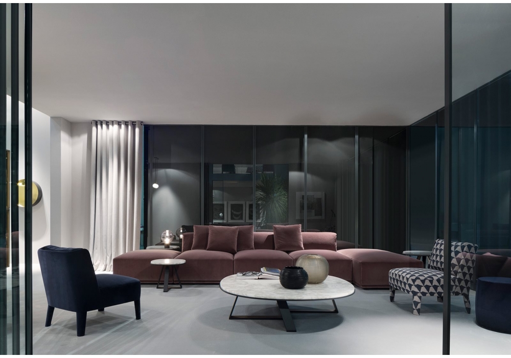 Judd Editions Shine designed by Andrea Parisio for Meridiani is a low tables collection with bronzed brass or black varnished frame with undershelf in the same finish. Table top available in marble, matt or glossy colours lacquered. It is made of different sizes.