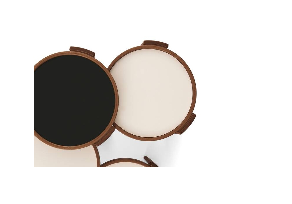 780/783 conçue par Gianfranco Frattini pour Cassina est une jeu de quatre tables basses superposables en hêtre teinté noyer ou bien laqué noir. Plateau reversible en laminé à deux surfaces: blanc et noir.