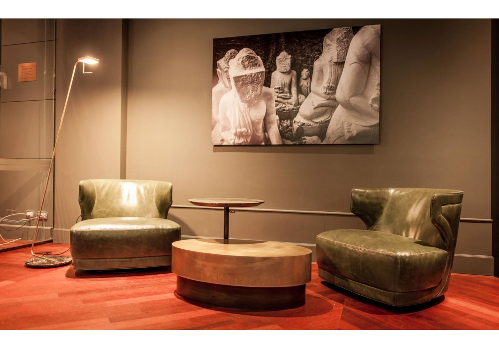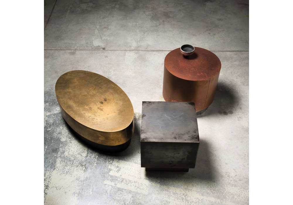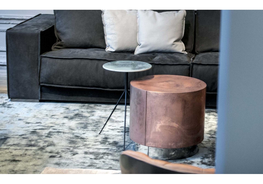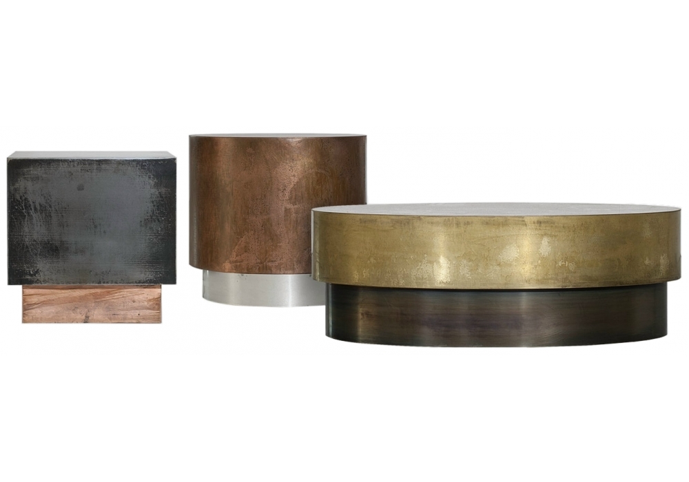 Loren conçue par Draga & Auriel pour Baxter est une belle table d'appoint avec structure en MDF teinté noir. Disponible en quatre formes différentes et en trois différentes finitions: partie supérieure en fer ancien et base en cuivre ancien semi- brillant, en cuivre ancien mat et base en acier chromé brillant, en laiton ancien avec base en laiton bruni.