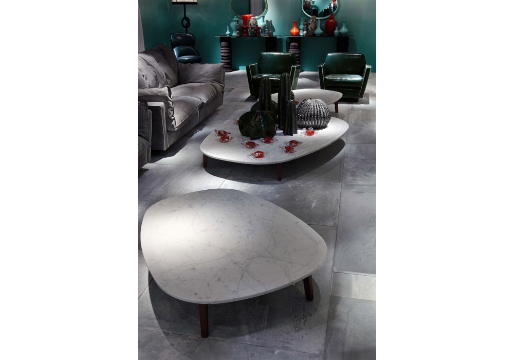 Vietri conçu par Paola Navone pour Baxter est une table basse avec base en frêne teintées de noyer brossé et plateau en forme, 2 cm, ¾ "d'épaisseur avec 0,5 cm, ¼" hod abaissement et évasage externe. Disponible en marbre blanc mat Gioia et en trois dimensions.
