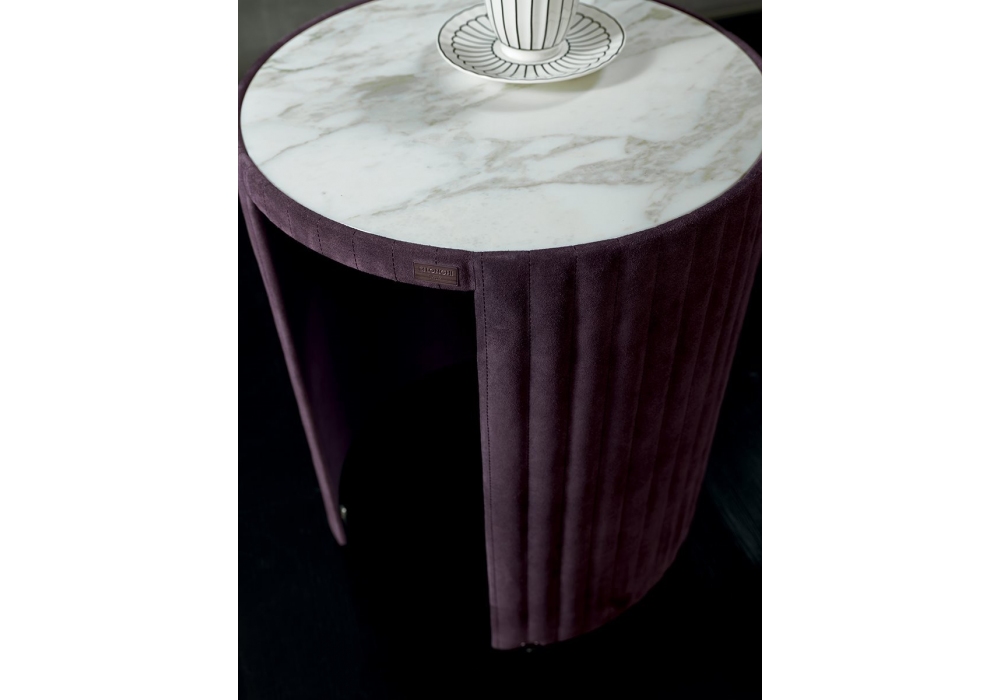 Sun conçue par AL1 pour Longhi est une table d'appoint avec structure en métal calandré ou recouverte de cuir matelassé à nervures verticales. Plateau en bois, marbre, cristal ou laqué brillant en différentes finitions. La version Ø 100 cm a un plateau rond en métal inséré dans le plateau. Disponible en différentes dimensions.