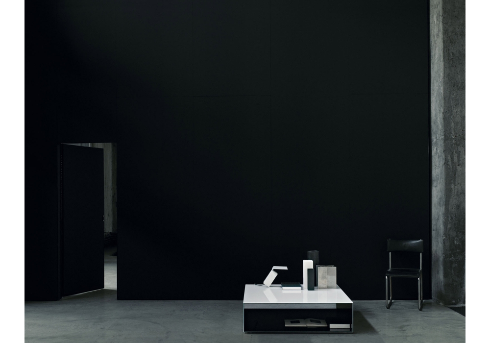 SiO2 Tunnel conçue par Piero Lissoni pour Glas Italia est une table basse dotée d'une double étagère en verre feuilleté couplé. Disponible en verre laqué brillant et en verre laqué mat, elle permet de combiner librement la couleur intérieure et extérieure. Pieds en aluminium.