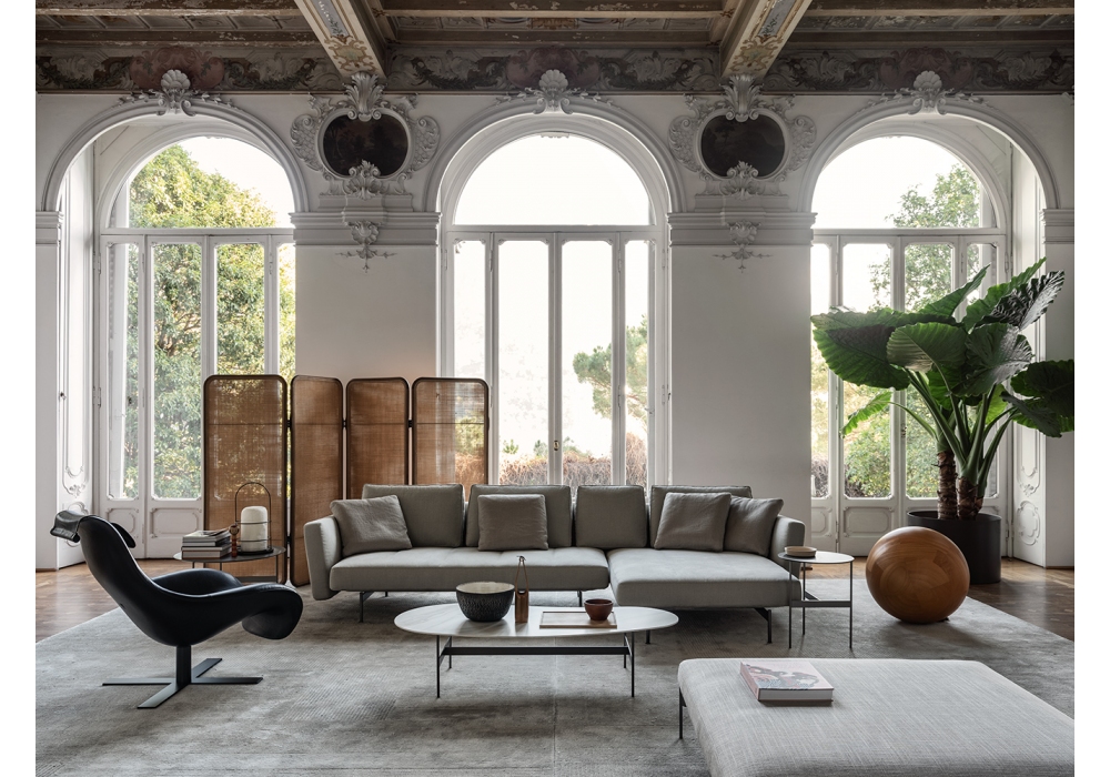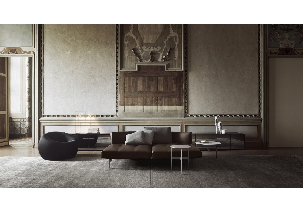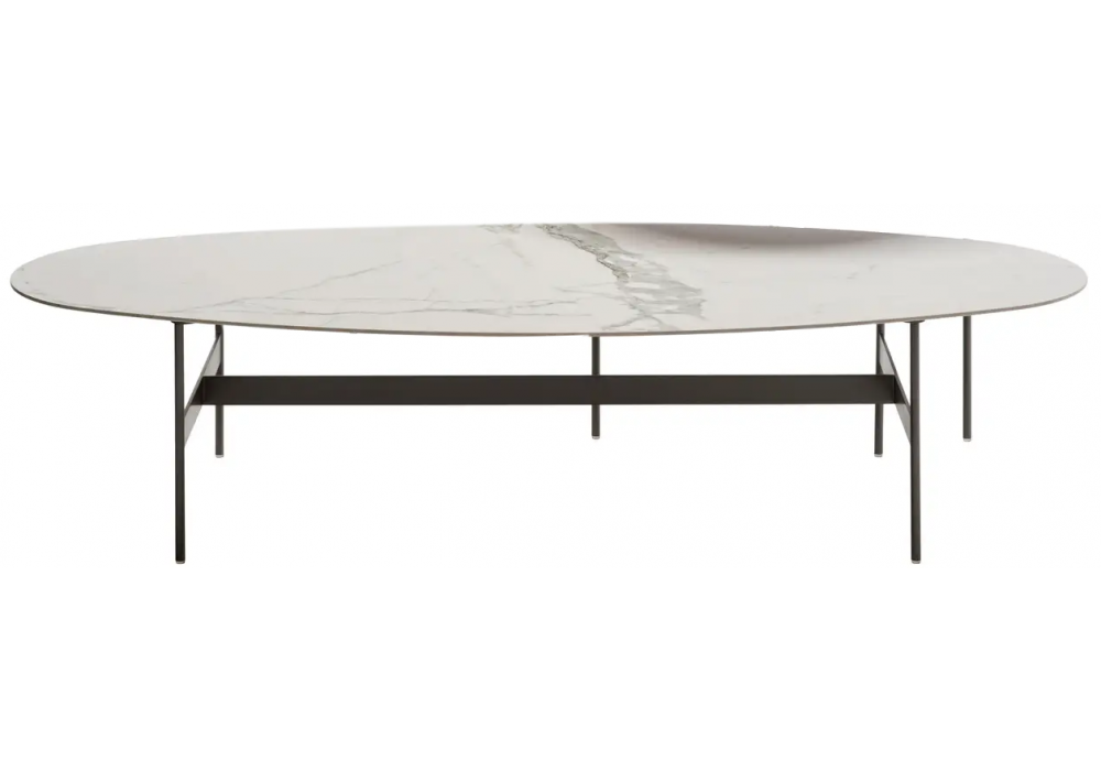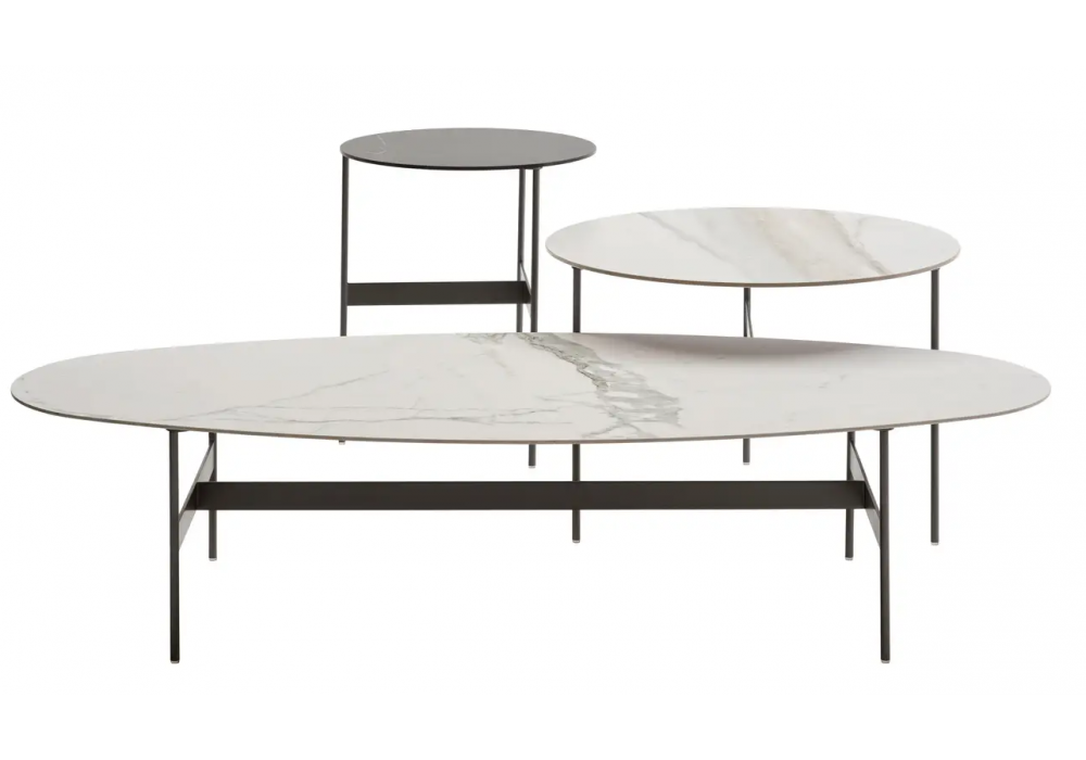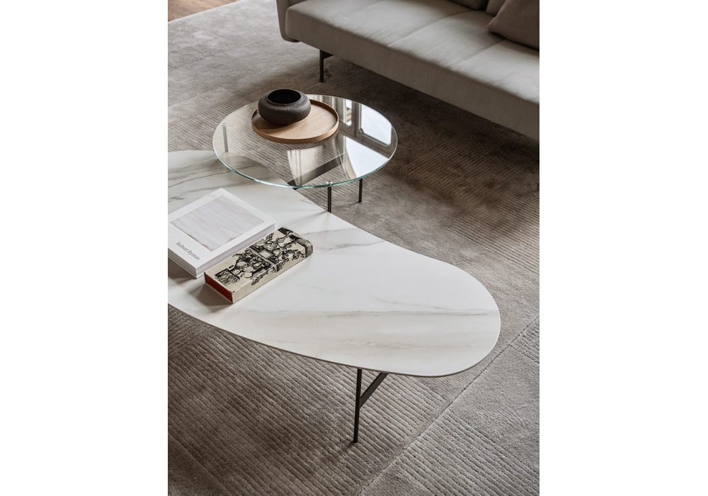 Formiche conçue par Piero Lissoni pour B&B Italia est une table basse avec structure en acier peint finition étain et plateau en verre extra clair transparent, en grès cérame blanc Calacatta ou en pierre grise. Disponible en différents modèles.