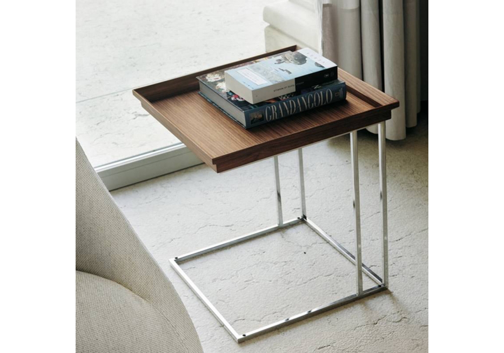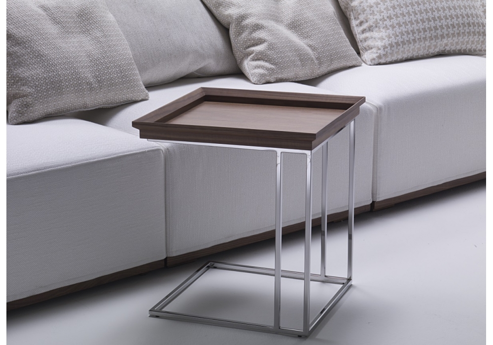 Cucù conçue par T. Colzani pour Porada est une table d'appoint avec structure en métal disponible en différentes finitions et plateau en noyer canaletta ou laqué mat pore fermé. Le plateau est amovible et devient instantanément un plateau pratique.