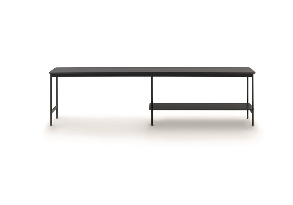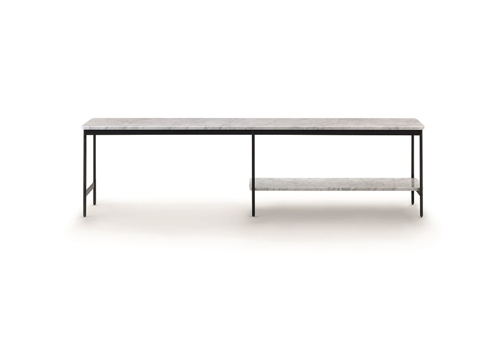 Capilano conçue par Luca Nichetto pour Arflex est une collection de tables d'appoint avec structure en métal laqué noir ou or et plateau en marbre ou en grès. Disponible en trois modèles différents.