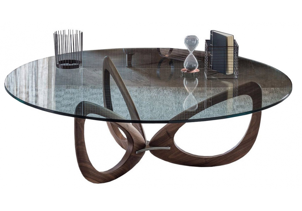 Helix conçue par Piero De Longhi pour Cattelan Italia est une table basse avec base en bois de noyer Canaletto massif et détails en acier laqué transparent. Plateau en verre clair. Disponible en différentes dimensions.