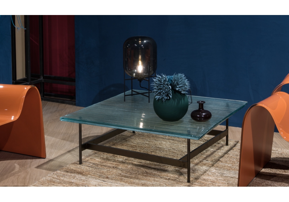 Waves conçue par Ludovica + Roberto Palomba pour Fiam est une table basse avec plateau en verre DV transparent, rayures colorées ou marbre. Piètement en métal finition titane mat ou nickel noir brillant. Tablette inférieure en option.
