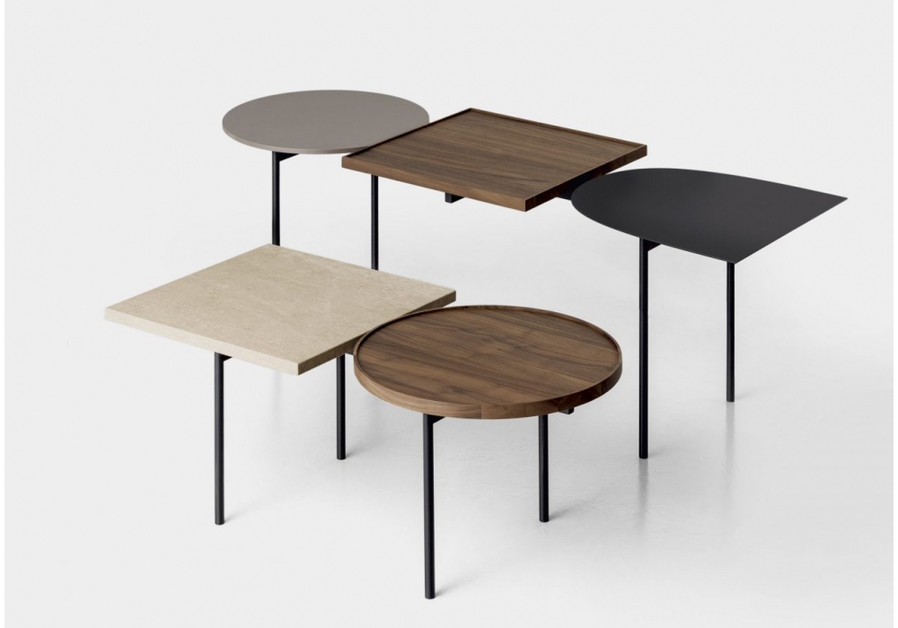 Constellations conçue par Luca Nichetto pour Kristalia est une table basse avec base en acier et plateau en pierre ou en bois. Disponible dans différentes configurations.