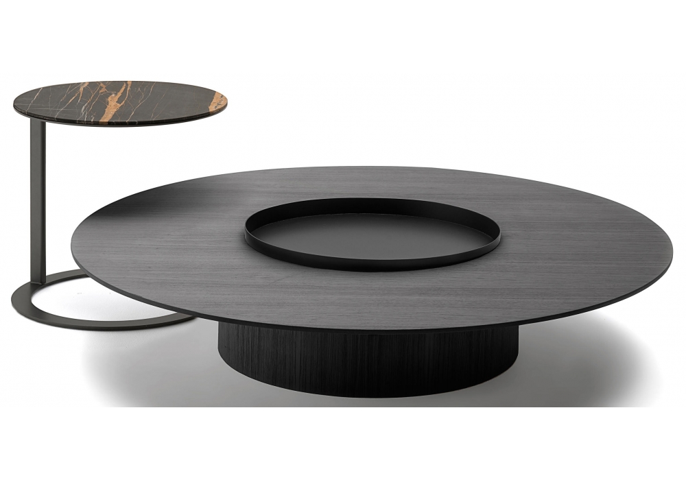 Tethys conçue par Oscar & Gabriele Burratti pour Living Divani est une table basse ronde en MDF avec dessus, disponible en différentes finitions, et base qui sert de compartiment de rangement.