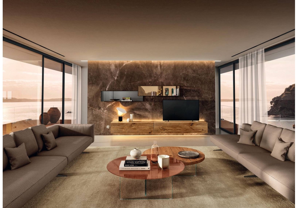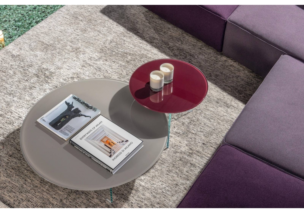 Air Round conçue par Daniele Lago pour Lago, est une table basse avec plateau en verre brillant ou opaque et pieds en verre extra-clair ou gris fumé. Disponible en différentes finitions et dimensions.