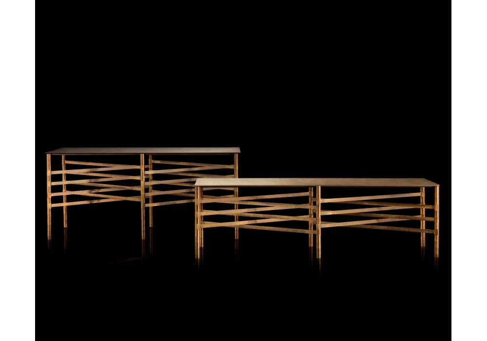 Network conçue par Massimo Castagna pour Henge est une table basse réalisée avec un plateau en bois ou en pierre. Les pieds sont constitués de tubes métalliques arrondis reliés par des barres métalliques rectangulaires qui se croisent. Network est disponible en différentes finitions et dimensions.
