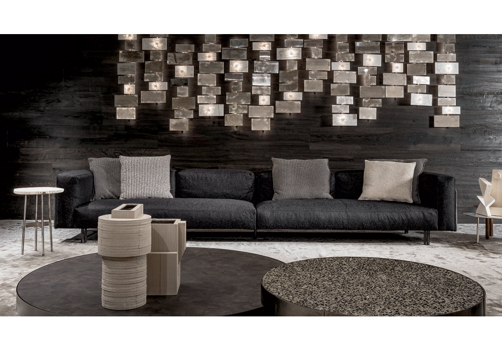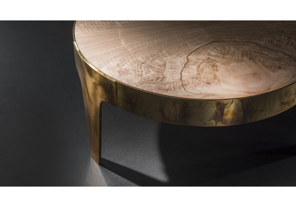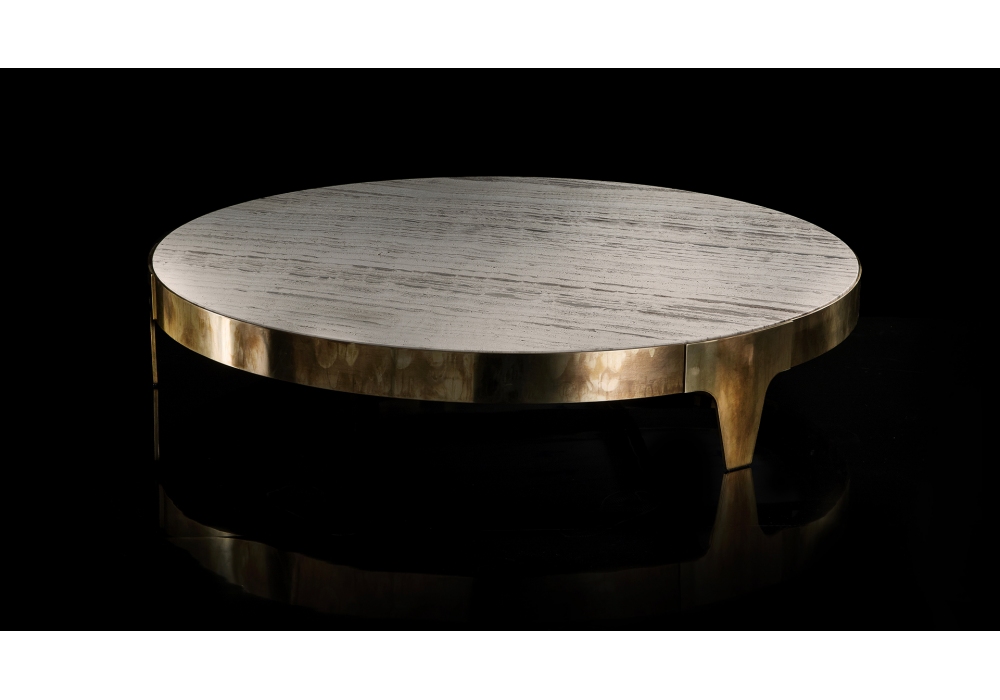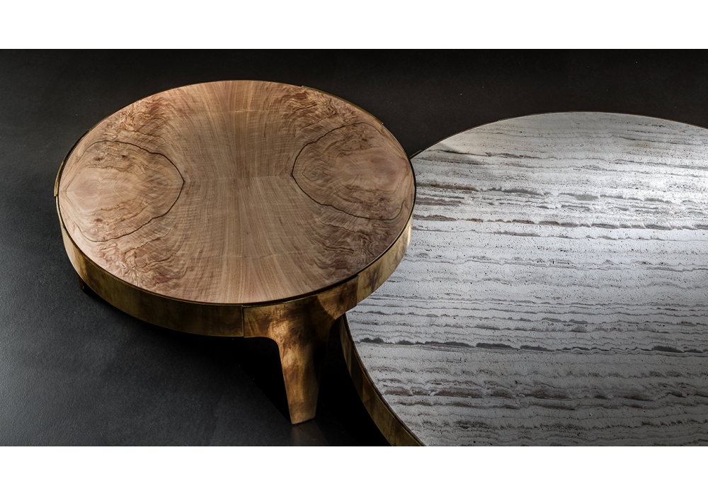 SR-Table conçue par Massimo Castagna pour Henge est une table basse ronde réalisée avec un plateau en pierre ou en bois et une structure en métal. Disponible en différentes finitions et dimensions.