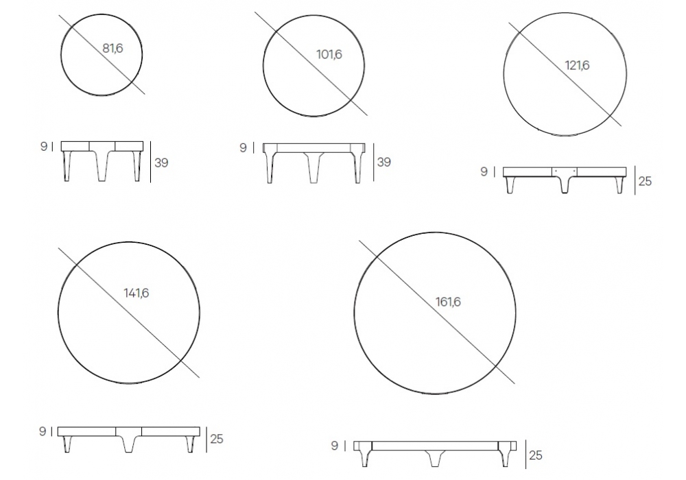 | Dimensions | Ø 81,6 x H 39 cm; Ø 101,6 x H 39 cm; Ø 121,6 x H 25 cm; Ø 141,6 x H 25 cm; Ø 161,6 x H 25 cm. |