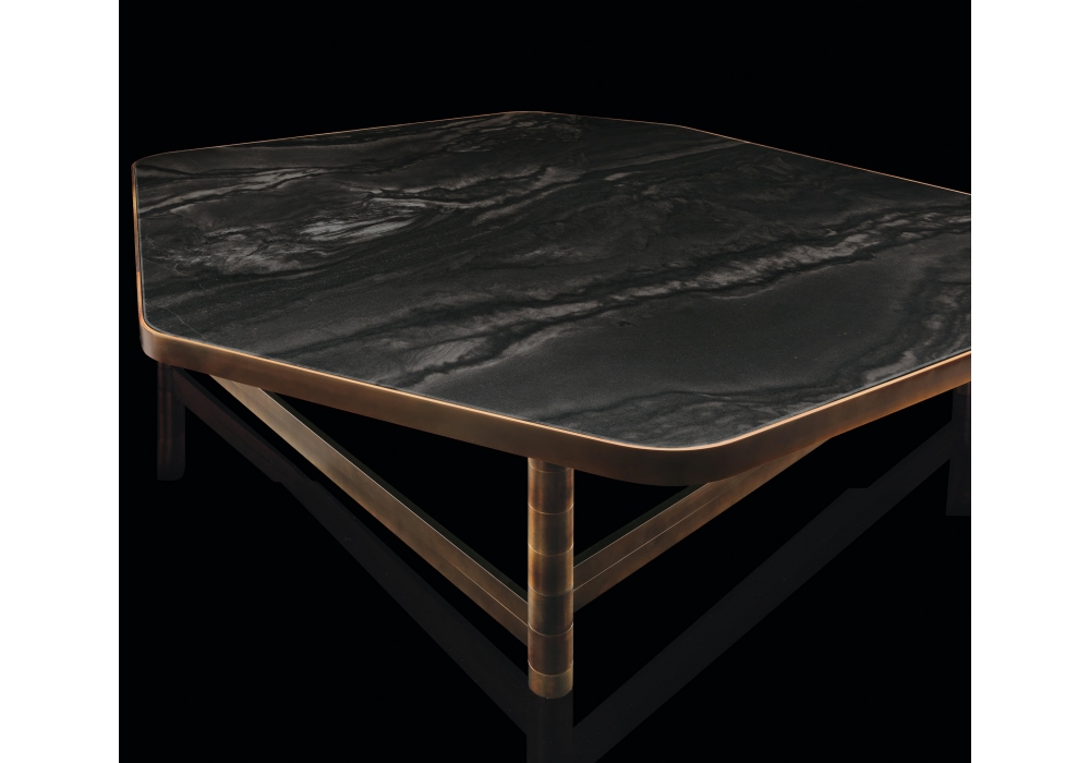OR Table conçue par Massimo Castagna pour Henge est une collection de tables basses avec structure en laiton bruni à la main. Plateau polygonal en pierre ou en bois, disponible en différentes finitions.