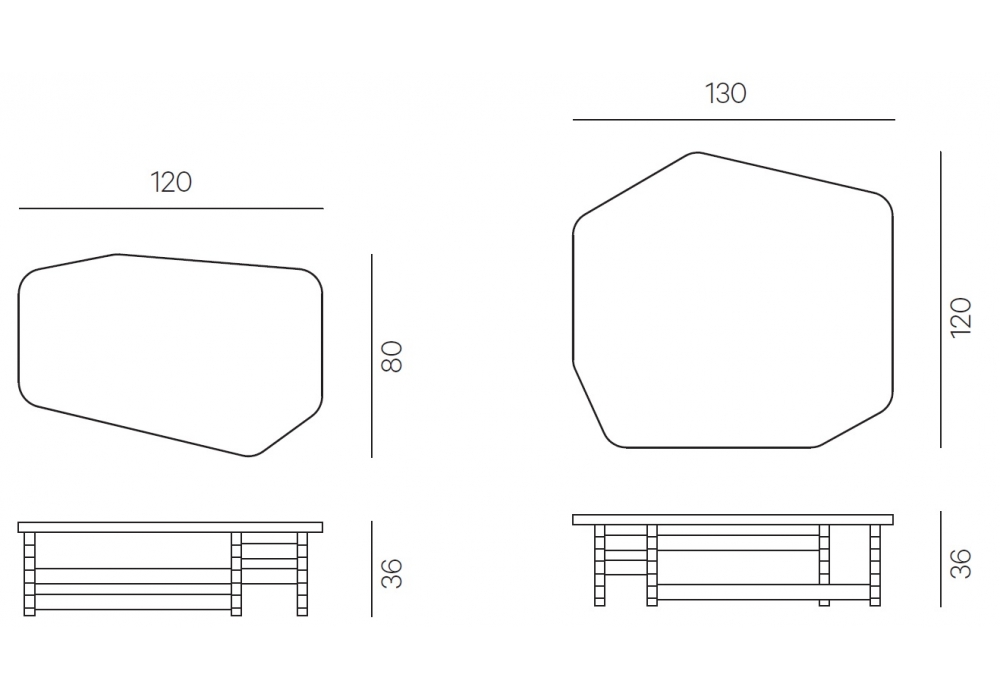 | Dimensions | 120 x 80 x H 36 cm; 130 x 120 x H 36 cm. |