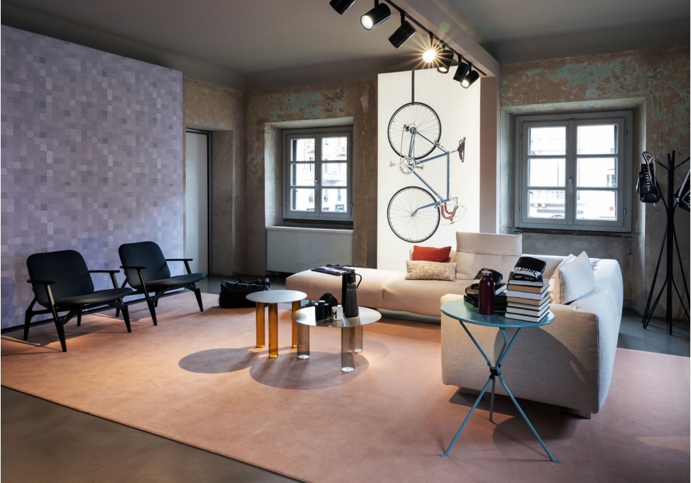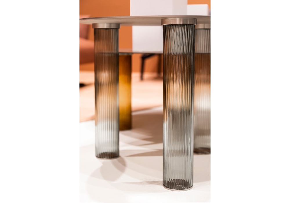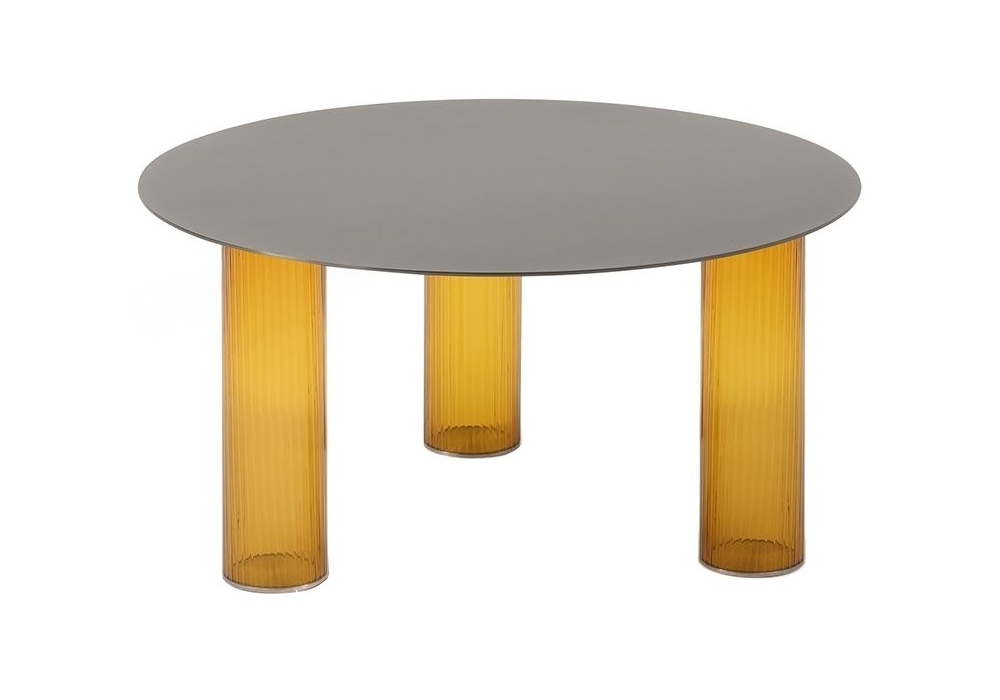 667 Echino conçue par Sebastian Herkner pour Zanotta est une table basse réalisée avec des pieds en verre soufflé à trois couches de couleur fumée ou ambre. Plateaux en tôle d'acier nickelé de couleur naturelle ou noire.