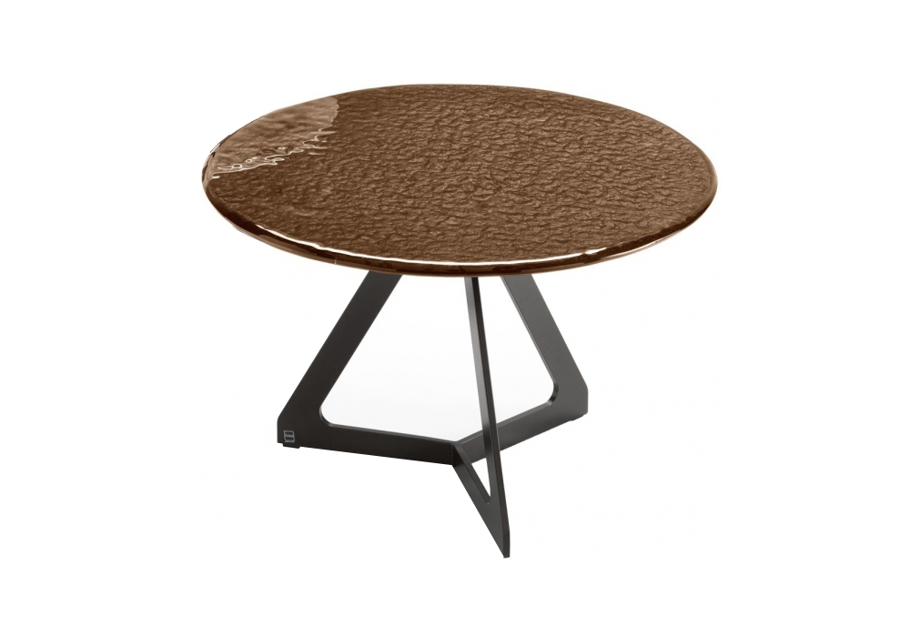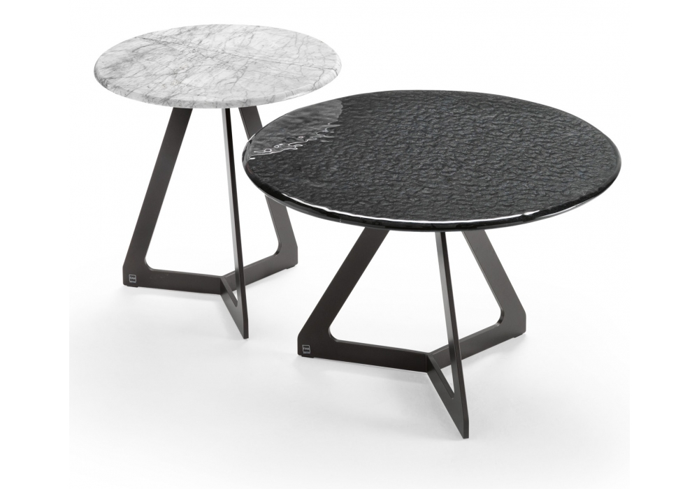 Lakes conçue par Studio Klass pour Fiam est une table basse avec plateau en verre fondu rétro-peint avec des nuances métalliques, ou en marbre et base en métal peint.