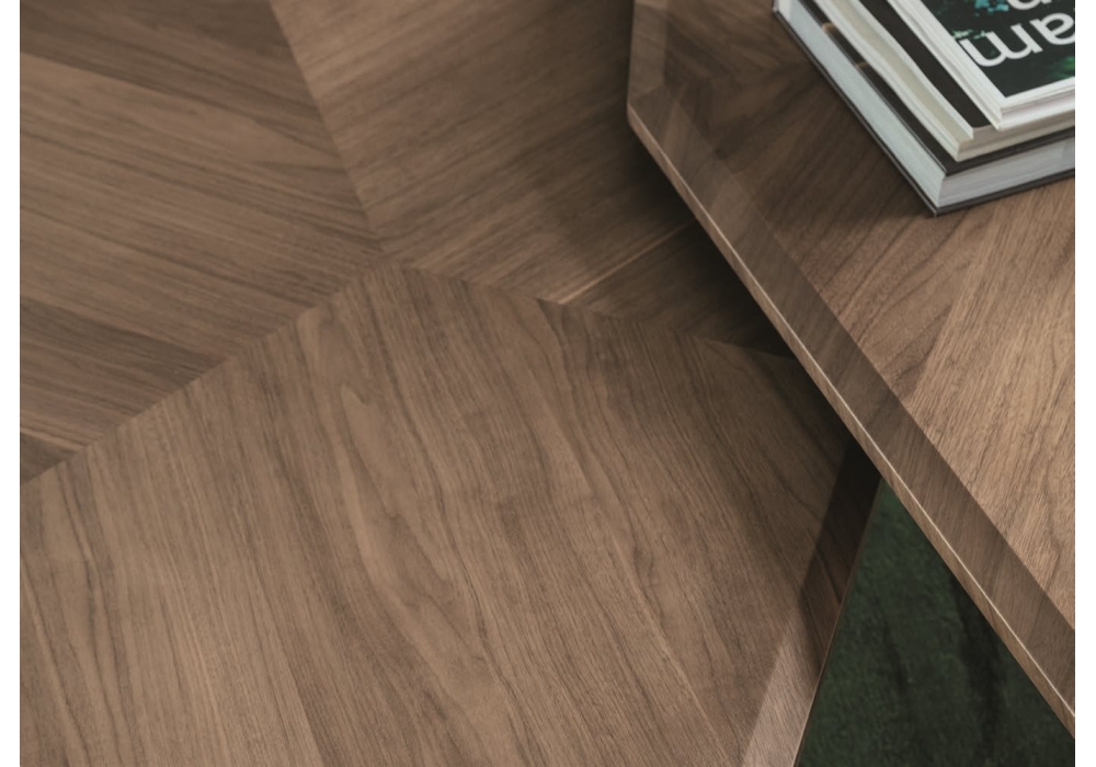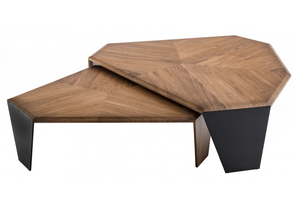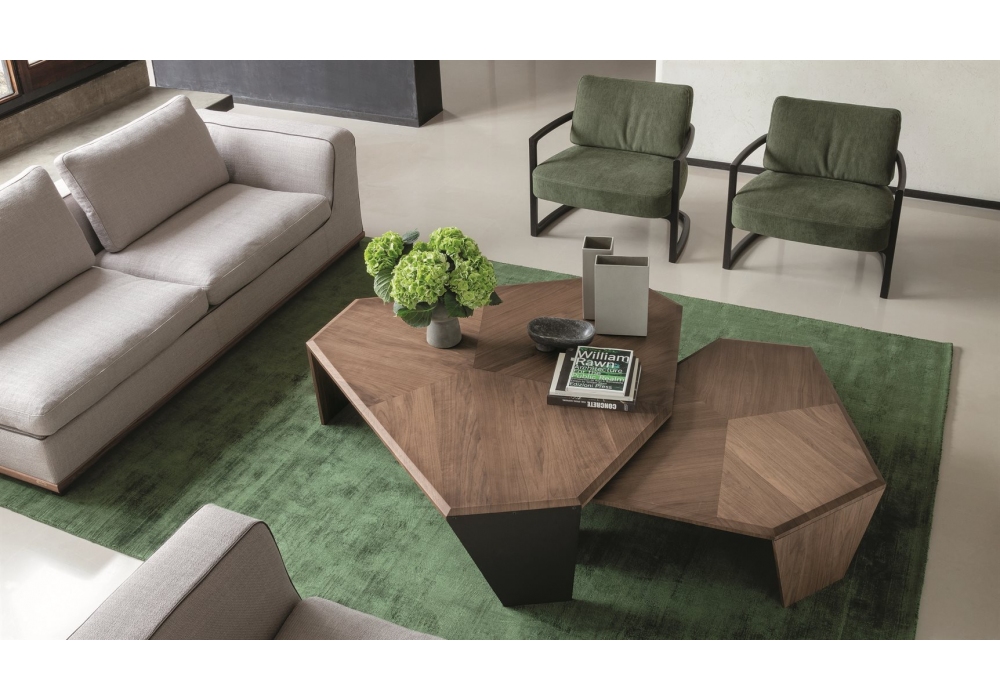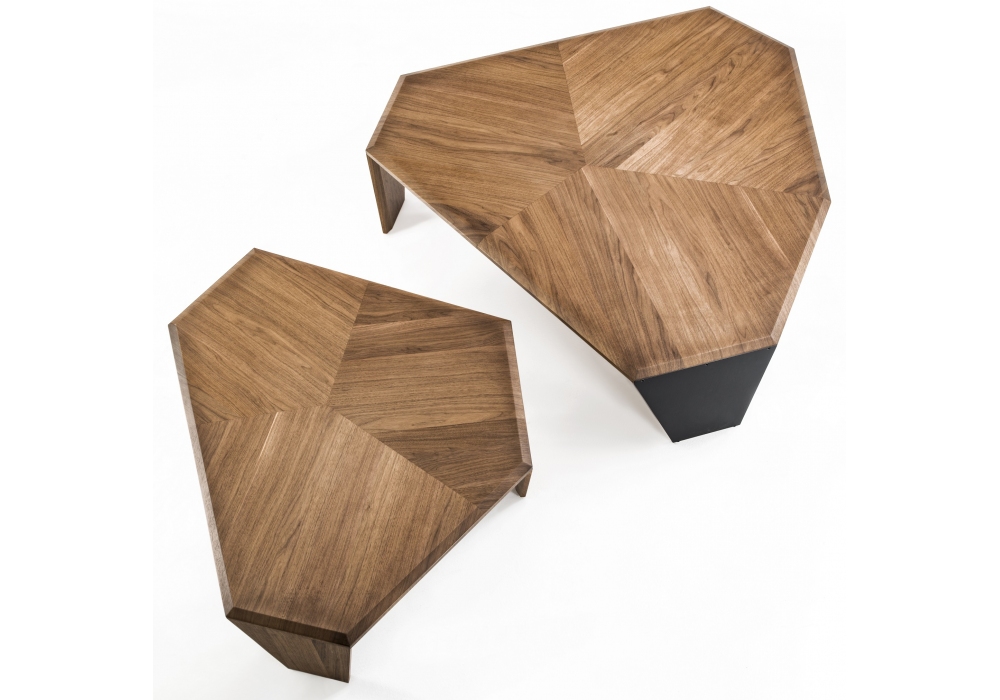 Tortuga conçue par Jiun Ho pour Porada est une table basse à trois pieds realisèe entièrement en noyer canaletta avec un pied en métal noir. Disponible en deux dimensions.