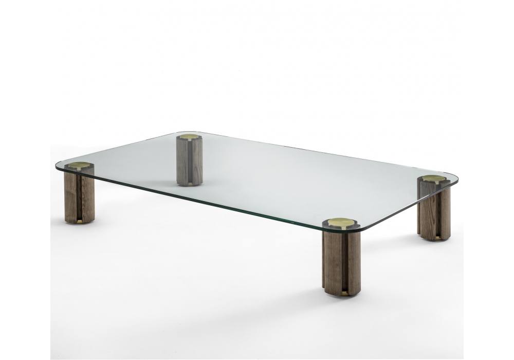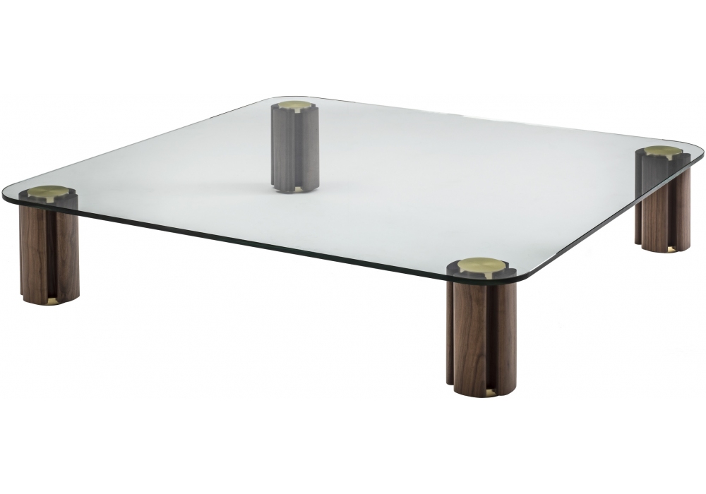 Quadrifoglio conçue par Carlo Ballabio pour Porada est une table basse avec plateau en verre transparent, proposée dans les versions rectangulaire et carrée. Pieds en bois disponibles dans les finitions suivantes: Noyer Canaletta, bois de frêne, laqué mat à pores ouverts ou fermés. Détails métalliques en laiton brossé.