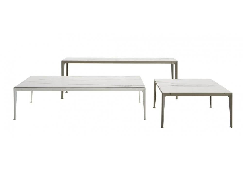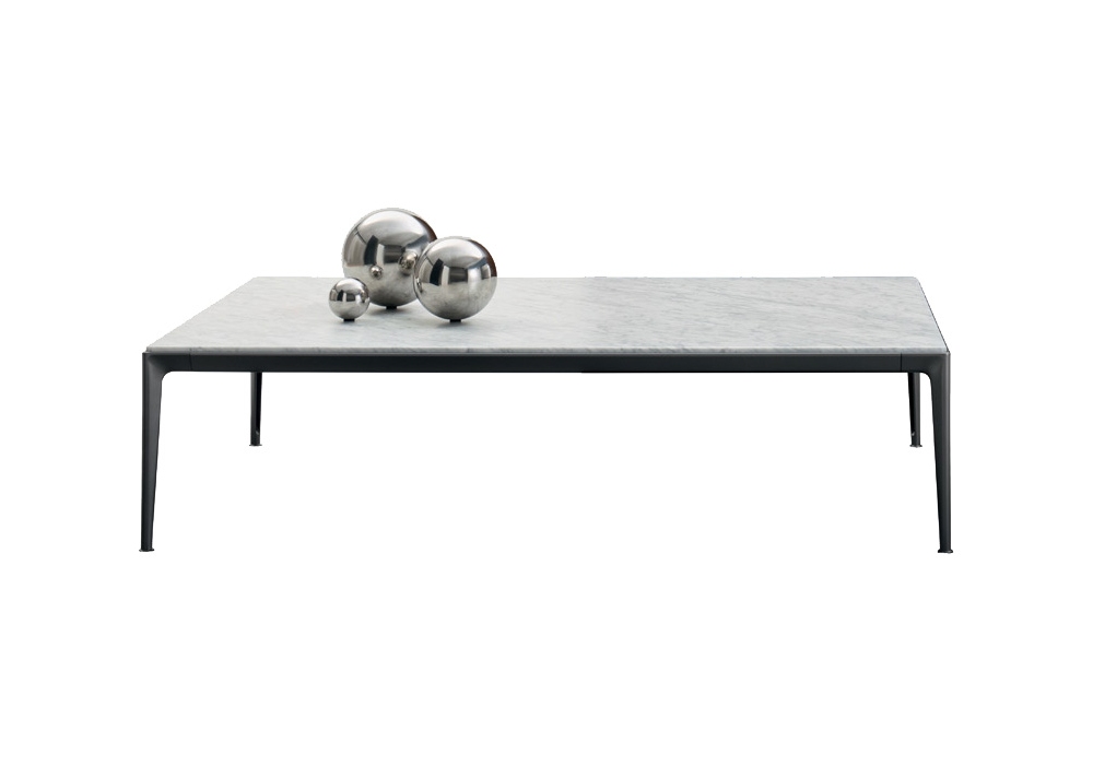 Mirto Indoor conçue par Antonio Citterio pour B&B Italia est une table basse réalisée avec une structure en aluminium brossé ou peint. Plateau en verre réfléchissant peint, marbre, placage bois. Disponible en différentes dimensions.