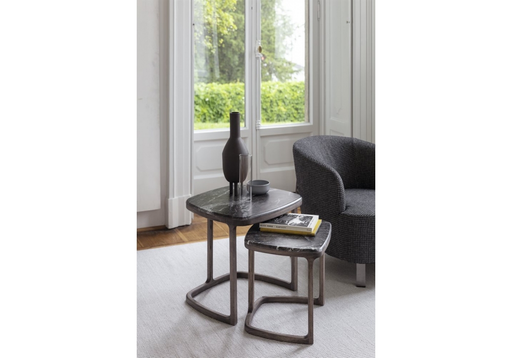 Antigone conçue par Emmanuel Gallina pour Porada est une table basse avec structure en frêne massif ou laqué à pores ouverts et plateau en marbre avec bord peint mat. Disponible en deux tailles.