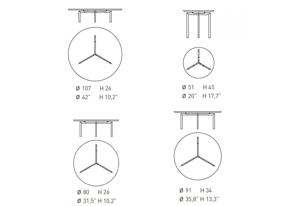 | Diamètre de plateau | Ø 51 cm; Ø 80 cm; Ø 107 cm; Ø 91 cm. |