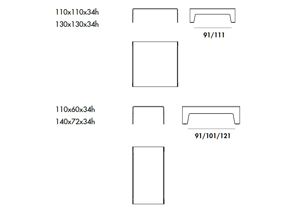 | Dimensions | 110 x 60 x H 34 cm; 140 x 72 x H 34 cm; 110 x 110 x H 34 cm; 130 x 130 x H 34 cm |