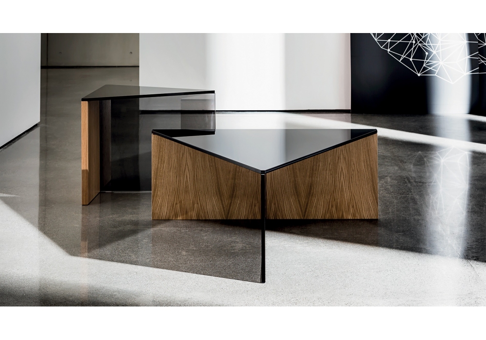 Regolo Triangulaire conçue par Lievore, Altherr, Molina pour Sovet est une table basse réalisée avec un plateau en verre feuilleté noir ou un plateau en bois. Dans la version avec plateau en verre, la base est composée d'un élément en verre fumé et d'un élément en bois. Dans la version avec plateau en bois, la base est composée d'un élément en verre fumé et d'un élément en verre feuilleté noir. Disponible en différentes finitions et dimensions.