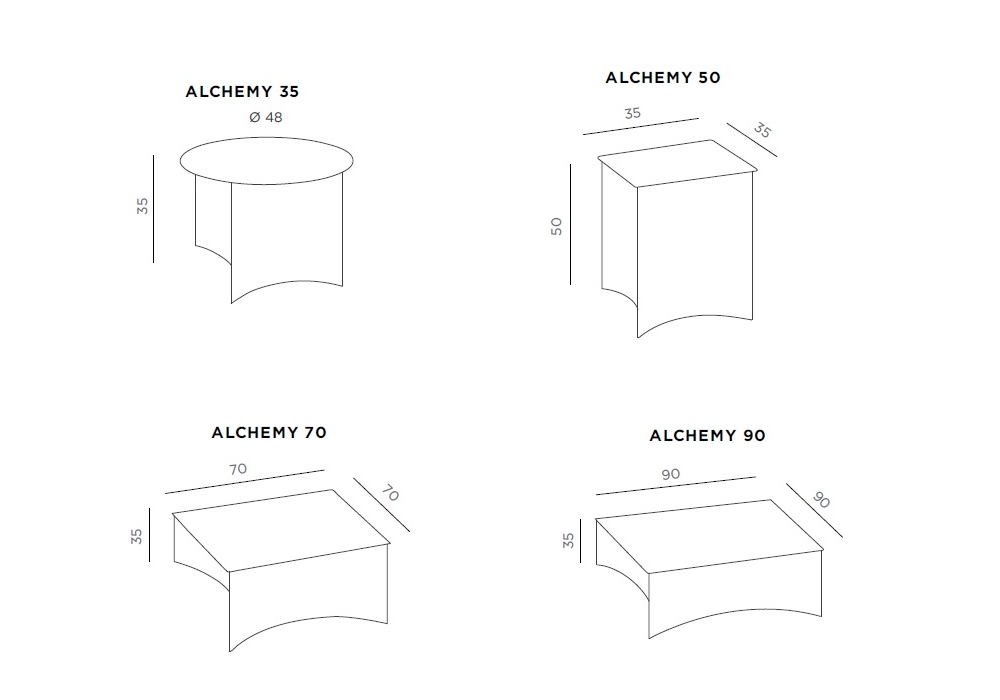| Dimensions | • Ø 48 x H 35 cm; • 35 x 35 x H 50 cm; • 70 x 70 x H 35 cm; • 90 x 90 x H 35 cm |