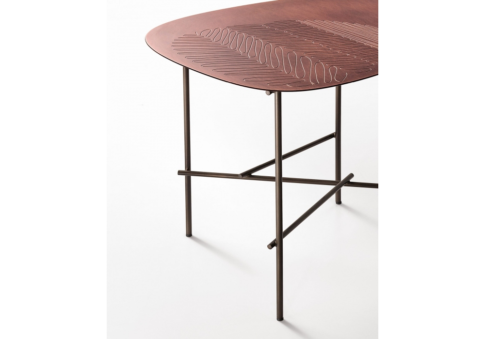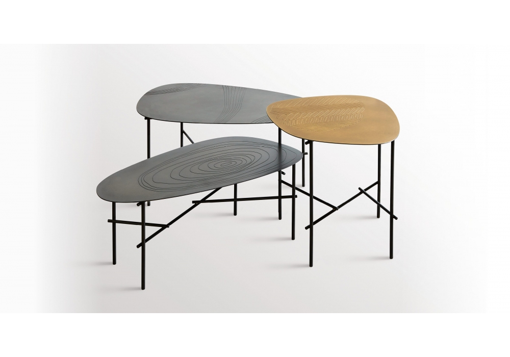 Syro conçue par Emilio Nanni pour DeCastelli est une table basse en métal avec plateau façonné et gravé. Disponible en différentes finitions et dimensions.