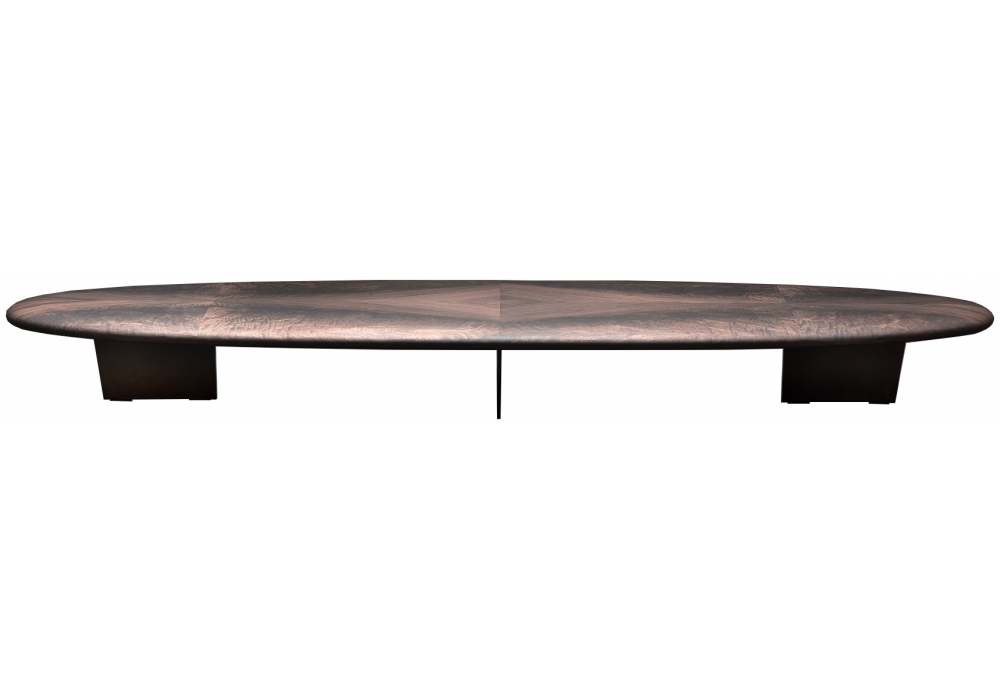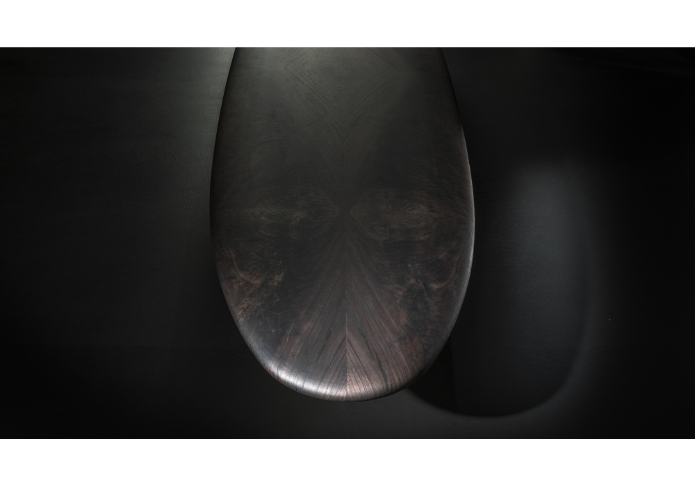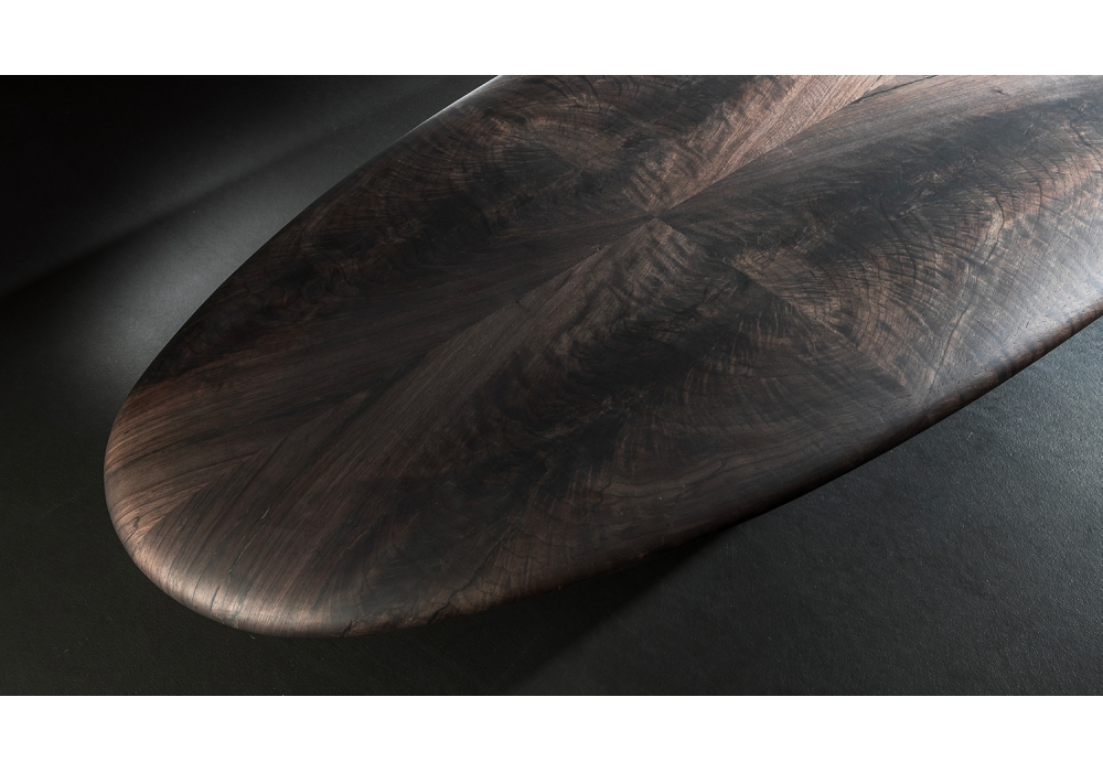 Blown Out conçue par Massimo Castagna pour Henge est une table basse réalisée avec une structure en acier bruni noir et un plateau en bois.