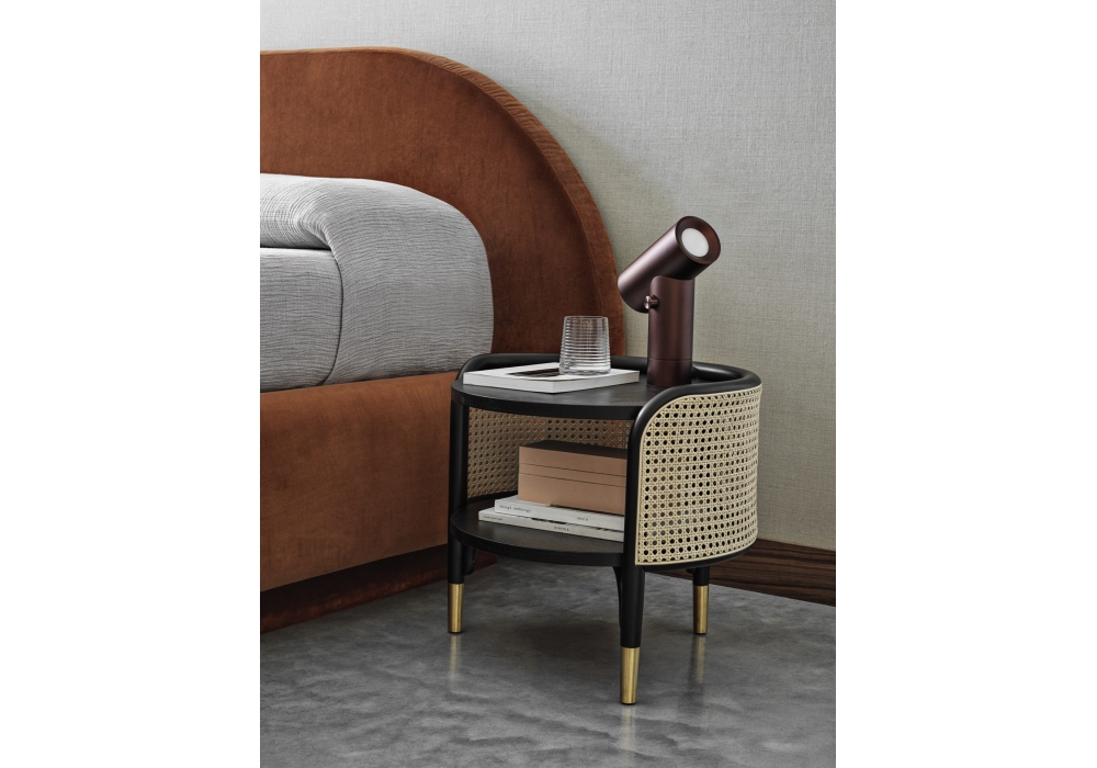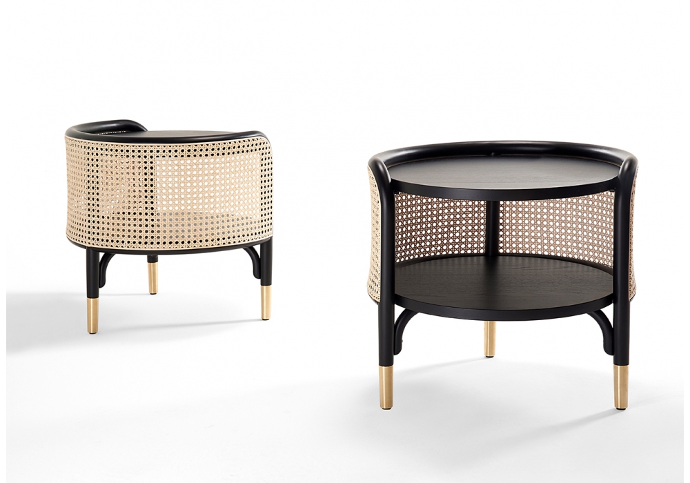 Mos conçue par GamFratesi pour Gebrüder Thonet Vienna est une table d'appoint avec structure en hêtre cintré et inserts en paille de Vienne. Étagères en plaqué frêne teinté à pores ouverts. Pieds en laiton.