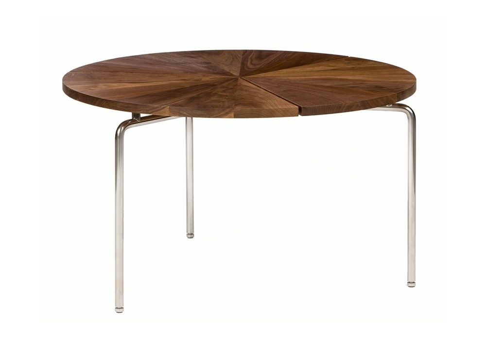Mesa circular diseñada por Craig Bassam para Bassam Fellows, compuesta por 4 piezas de madera separadas entre sí, y unidas por un tubo de latón, base de dos acabados, bronce y acero inoxidable macizo recubierto con nanocerámica.