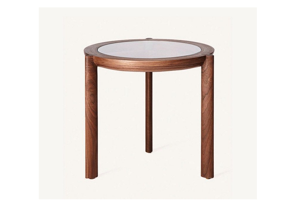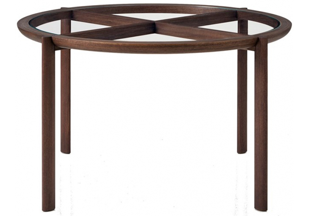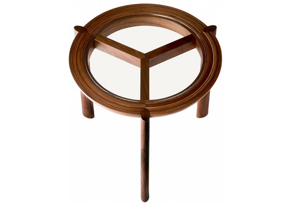 Table basse Spoke conçue par Craig Bassam pour BassamFellows, réalisée en différentes finitions bois, avec un plateau en verre, la structure soutenue par 3 pieds ovales.