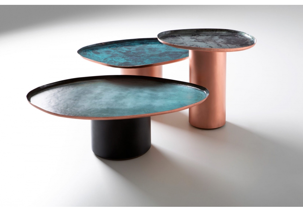 Drops conçue par Zanellato et Bortotto pour DeCastelli est une table basse en cuivre avec plateau de forme organique. Disponible en 3 dimensions.
