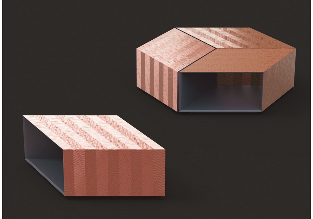 Alpha conçue par Martinelli Venezia pour DeCastelli est une table basse à base de rhomboïdes. La forme simple le rend modulaire: en le combinant avec d'autres éléments identiques, translatés ou tournés. Le cuir cuivré naturel travaillé avec la technique DeErosion crée un motif à rayures diagonales qui met en valeur les géométries et accentue l'effet graphique. Structure interne en bois laqué.