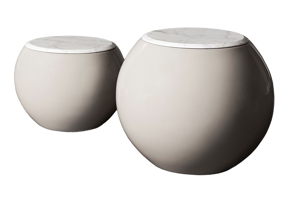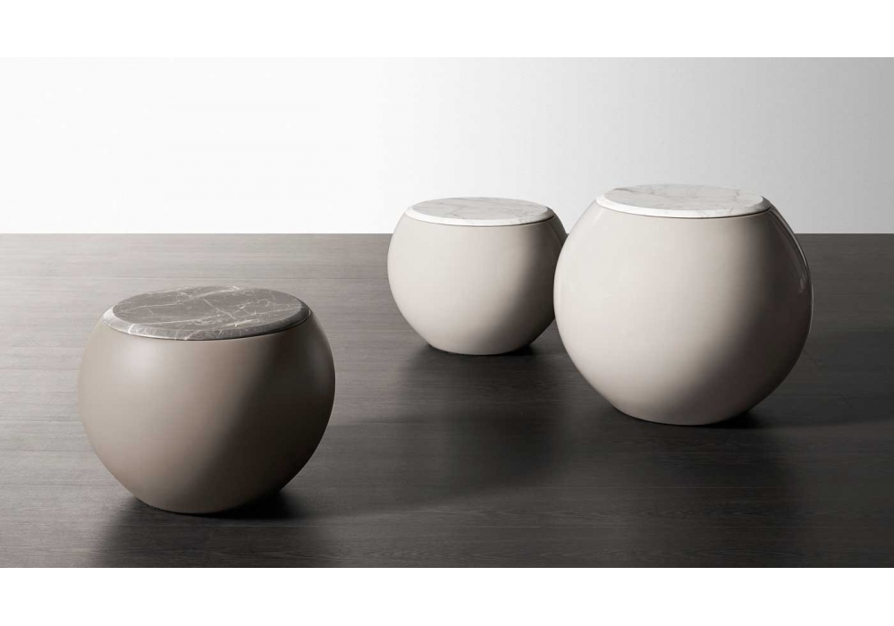 Bongo conçu par Andrea Parisio pour Meridiani est une collection de tables basses avec plateau em marbre et base en polyuréthane à roulement rigide avec finition mate ou brillante.